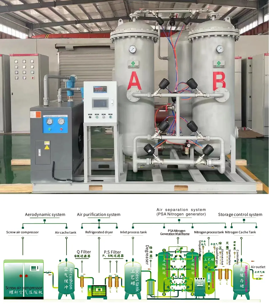 Không khí làm mát trước: Nó được làm mát đến nhiệt độ thích hợp trong hệ thống làm mát trước khi tách nước tự do. Tinh chế tách không khí: chất hấp phụ loại bỏ nước, carbon dioxide và các hydrocarbon khác trong chất hấp phụ.